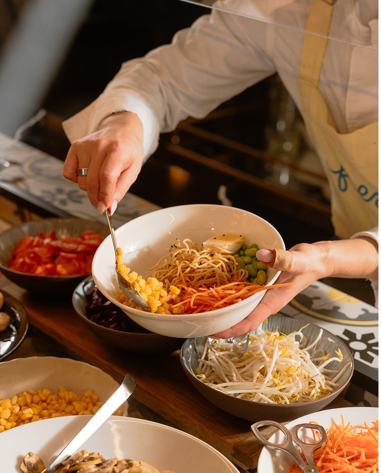 Au comptoir, choisissez parmi des variétés de sauces, de toppings, salade, pâte ou plats sains, vous êtes le chef.